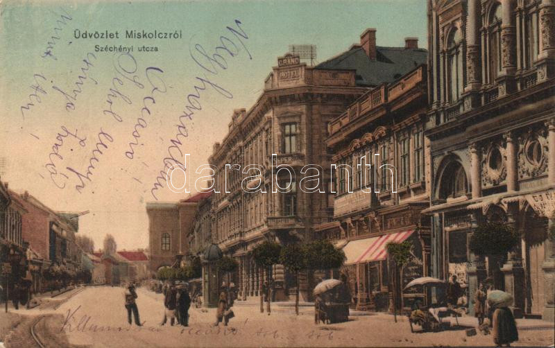 Miskolc Széchenyi utca, Grand Hotel https://www.darabanth.com/de/10-Gross-Auktion/10.1/Ansichtskarten-Ungarn/~2737/Miskolc-Szechenyi-utca-Grand-Hotel~II305159