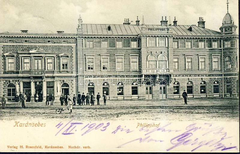 Karánsebes Philipphof Central Café https://www.darabanth.com/de/10-Gross-Auktion/10.1/Ansichtskarten-Ungarn/~2738/Karansebes-Philipphof-Central-Cafe~II301747