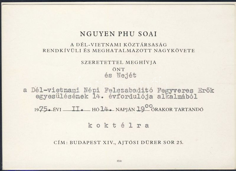 1975 és 1980 2 meghívó a Dél-Vietnami és a Kínai Nagykövetség koktélj... https://www.darabanth.com/de/100-Fernauktion/100.0/Andere-Sammelgebiete/~270/1975-es-1980-2-meghivo-a-Del-Vietnami-es-a-Kinai-Nagykovetseg-kokteljara~II235194