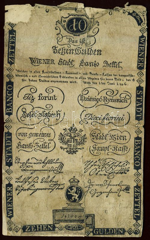 1806. 10G Wiener Stadt Banco Zettel T:papírlapra felkasírozva, hiányos https://www.darabanth.com/de/100-Fernauktion/100.0/Numismatik/~100021/1806-10G-Wiener-Stadt-Banco-Zettel-Tpapirlapra-felkasirozva-hianyos~II235432