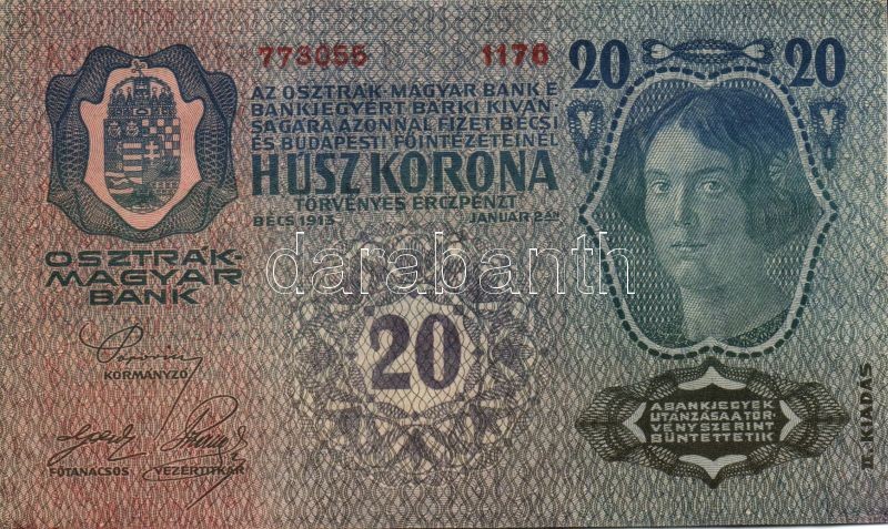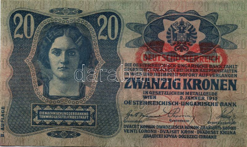 1913. 20K piros, vízszintes "Deutschösterreich" fny-sal T:I https://www.darabanth.com/de/100-Fernauktion/100.0/Numismatik/~100021/1913-20K-piros-vizszintes-Deutschosterreich-fny-sal-TI~II237624