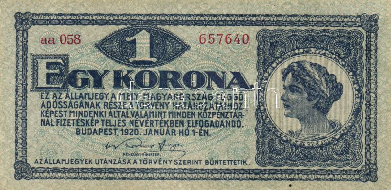 1920. 1K(2x) egymásutáni sorszámokkal T:I- https://www.darabanth.com/de/100-Fernauktion/100.0/Numismatik/~100021/1920-1K2x-egymasutani-sorszamokkal-TI-~II234999