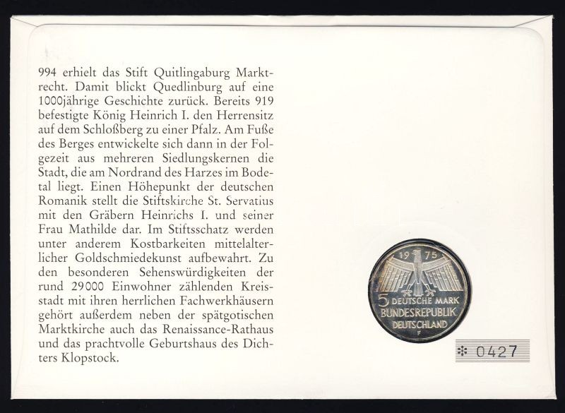 NSZK 1975. 5M Ag "Műemlékvédelem" érmés, bélyeges borítékon T:1 https://www.darabanth.com/de/100-Fernauktion/100.0/Numismatik/~100023/NSZK-1975-5M-Ag-Muemlekvedelem-ermes-belyeges-boritekon-T1~II237055