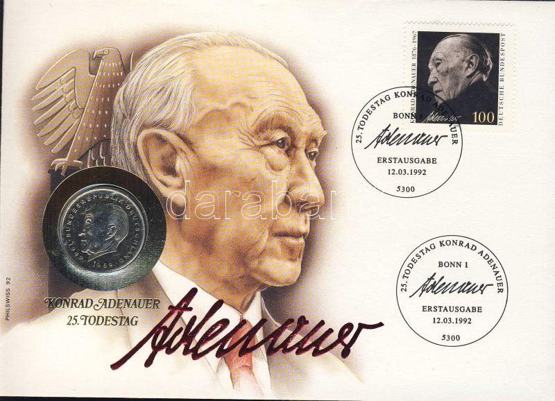 NSZK 1987. 2M "Konrad Adenauer" érmés, bélyeges borítékon T:2 https://www.darabanth.com/de/100-Fernauktion/100.0/Numismatik/~100023/NSZK-1987-2M-Konrad-Adenauer-ermes-belyeges-boritekon-T2~II237060