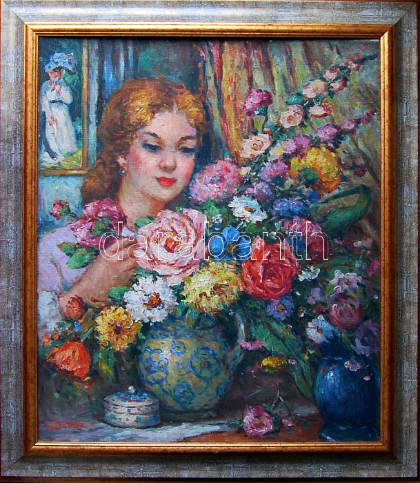 Beschreibung: Szarka Péter (1964-): Virágöntöző lány, olaj, vászon, szignált keretben 60x70cm