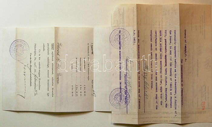 Beschreibung: 1911 USA halotti bizonytvány közjegyzői ellenjegyzéssel és a philedelphiai osztrák magyar konzulátus tanúsítványával