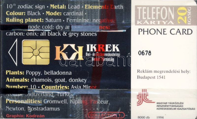1994 Csillagjegyek: Ikrek 20 egységes telefonkártya bontatlan csomagol... https://www.darabanth.com/de/101-Fernauktion/101.0/Andere-Sammelgebiete/~309/1994-Csillagjegyek-Ikrek-20-egyseges-telefonkartya-bontatlan-csomagolasban~II239290
