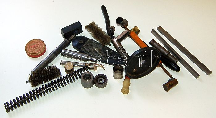 Beschreibung: Vadász hagyaték tétel, benne: lőportartó, csappantyú. gyutacs, hüvelynyomó, fojtás, stb...