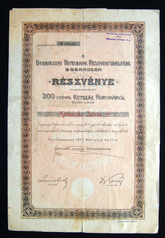 1910. "Debreczeni Hitelbank Részvénytársaság" részvénye 200K-ról, szel... https://www.darabanth.com/de/101-Fernauktion/101.0/Numismatik/~30010/1910-Debreczeni-Hitelbank-Reszvenytarsasag-reszvenye-200K-rol-szelvenyekkel~II238829