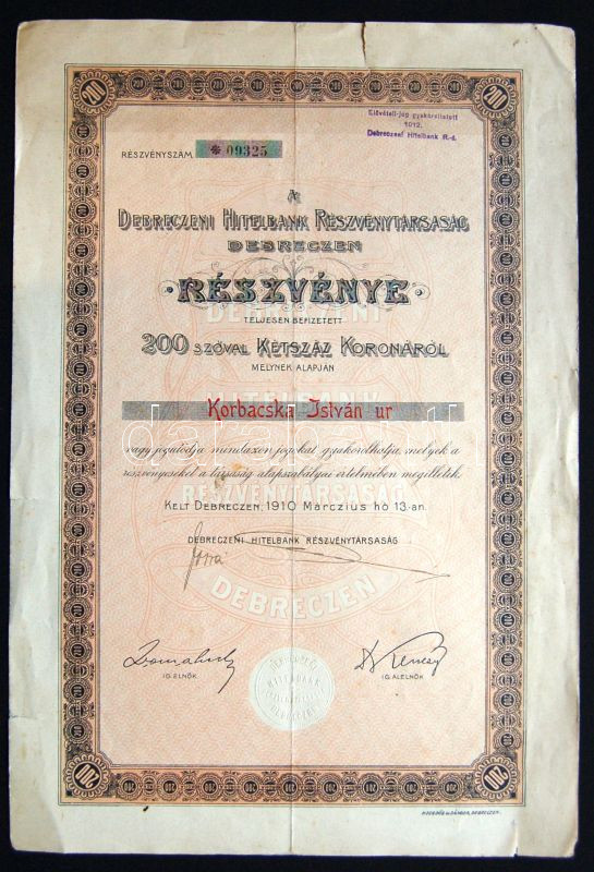 1910. "Debreczeni Hitelbank Részvénytársaság" részvénye 200K-ról, szel... https://www.darabanth.com/de/101-Fernauktion/101.0/Numismatik/~30010/1910-Debreczeni-Hitelbank-Reszvenytarsasag-reszvenye-200K-rol-szelvenyekkel~II238830
