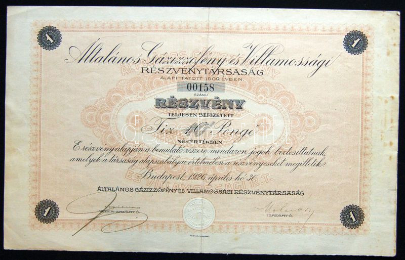 1926. "Általános Gázizzófény és Villamossági Részvénytársaság" részvén... https://www.darabanth.com/de/101-Fernauktion/101.0/Numismatik/~30010/1926-Altalanos-Gazizzofeny-es-Villamossagi-Reszvenytarsasag-reszvenye-10P-rol-szel~II238826