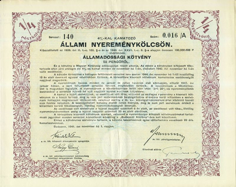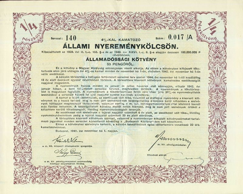 1941. Államadóssági kötvénye 50P-ről (2x) egymásutáni sorszámokkal, sz... https://www.darabanth.com/de/101-Fernauktion/101.0/Numismatik/~30010/1941-Allamadossagi-kotvenye-50P-rol-2x-egymasutani-sorszamokkal-szelvenyekkel~II237972