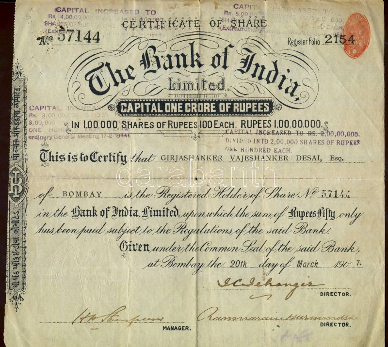 Brit-India 1907. Részvényigazolás, hátoldali forgalmi bejegyzésekkel +... https://www.darabanth.com/de/101-Fernauktion/101.0/Numismatik/~30010/Brit-India-1907-Reszvenyigazolas-hatoldali-forgalmi-bejegyzesekkel-plus-Nemet-BirodalomWeimari~II240354