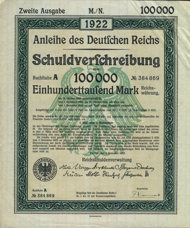 Beschreibung: Brit-India 1907. Részvényigazolás, hátoldali forgalmi bejegyzésekkel + Német Birodalom/Weimari Köztársaság 1922. Államadóssági kötvény 100.000M-ról