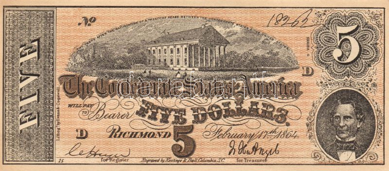 Amerikai Konföderált Államok 1864. 5$ facsimile kiadás T:II+ Csak egys... https://www.darabanth.com/de/101-Fernauktion/101.0/Numismatik/~30012/Amerikai-Konfoderalt-Allamok-1864-5USD-facsimile-kiadas-TIIplus-Csak-egyszer-hajtva~II238603