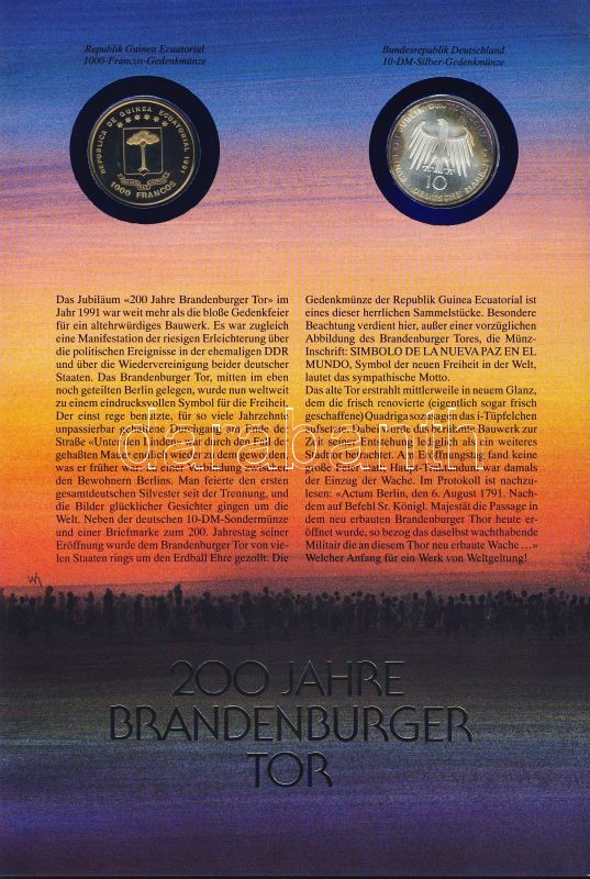 Beschreibung: Egyenlítői Giunea 1991. 1000Fr "Brandenburgi kapu" T:PP R! + NSZK 1991. 10M Ag "Brandenburgi kapu" T:BU Érmés emléklapon!