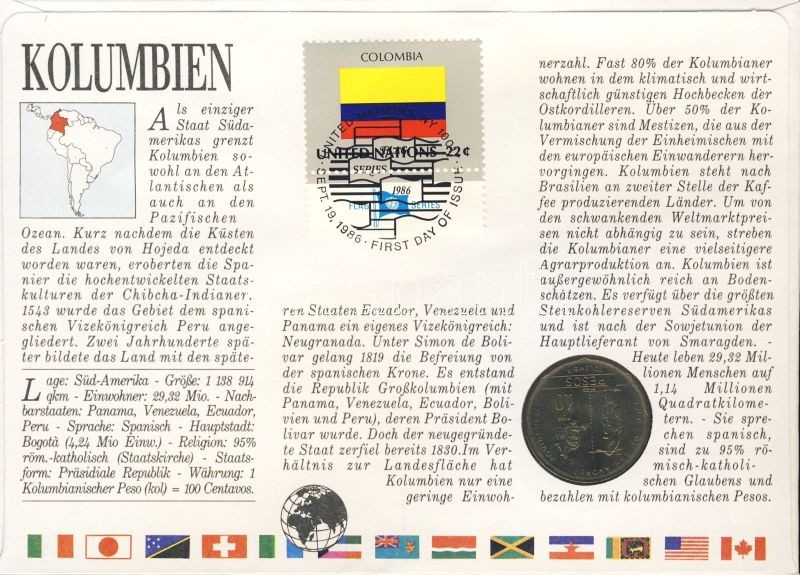 Beschreibung: Kolumbia 1985. 10P érmés, bélyeges borítékon T:2