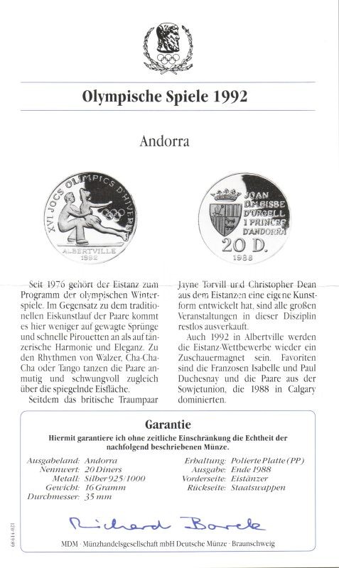 Andorra 1988. 20D Ag "Olimpia-műkorcsolya" T:PP Csak 15.000db! Tanúsít... https://www.darabanth.com/de/101-Fernauktion/101.0/Numismatik/~30019/Andorra-1988-20D-Ag-Olimpia-mukorcsolya-TPP-Csak-15000db-Tanusitvannyal~II236711
