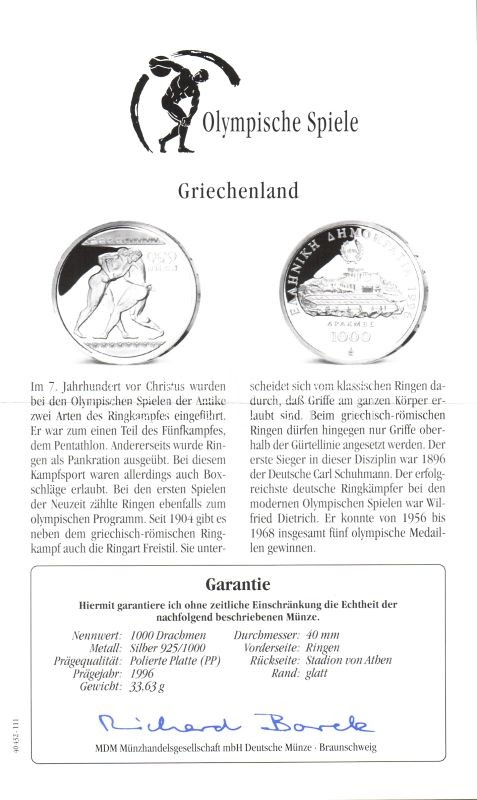 Görögország 1996. 1000Dr Ag "Olimpia-birkózás" T:PP Tanúsítvánnyal! https://www.darabanth.com/de/101-Fernauktion/101.0/Numismatik/~30019/Gorogorszag-1996-1000Dr-Ag-Olimpia-birkozas-TPP-Tanusitvannyal~II236651