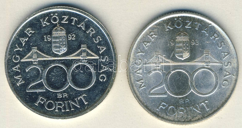 1992-93. 200Ft Ag "MNB" (2x) T:BU,2 https://www.darabanth.com/de/101-Fernauktion/101.0/Numismatik/~30020/1992-93-200Ft-Ag-MNB-2x-TBU-2~II239976