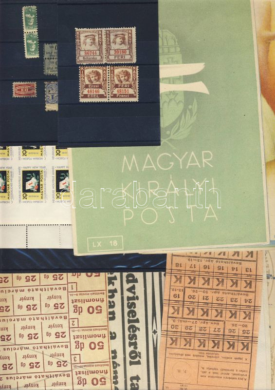 Beschreibung: Vegyes tétel: Újság fakszimile, bélyegsorsjegyek, dísztáviratok, élelmiszerjegyek, betétkönyvek