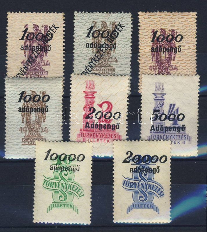 Beschreibung: 1946 Adópengő felülnyomott törvénykezési illetékbélyegek 8 db klf, stecklapon