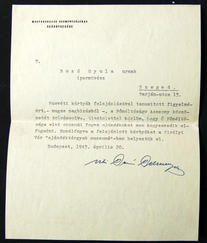 Beschreibung: 1943 A Kormányzó szárnységédje által írt köszönőlevél Bozó Gyul a éremtervezőnek és grafikusnak