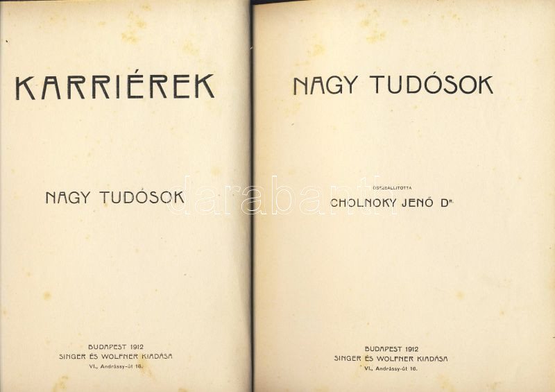1912 Cholnoki Dezső: Nagy tudósok könyve Kariérek kiadásában, szép áll... https://www.darabanth.com/de/103-Fernauktion/103.0/Andere-Sammelgebiete/~100142/1912-Cholnoki-Dezso-Nagy-tudosok-konyve-Karierek-kiadasaban-szep-allapotban~II247598
