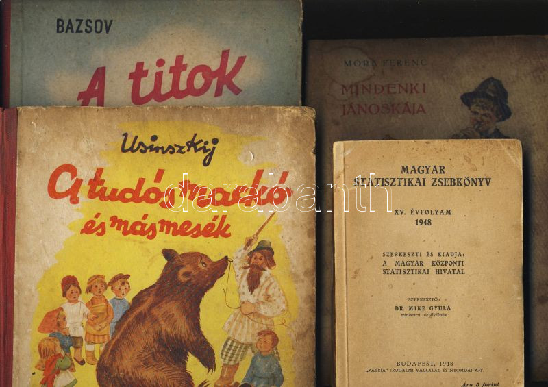 Beschreibung: 1944-1950 Két régi mesekönyv, Magyar statisztikai zsebkönyv illetve Móra Ferenc: Mindenki Jánoskája