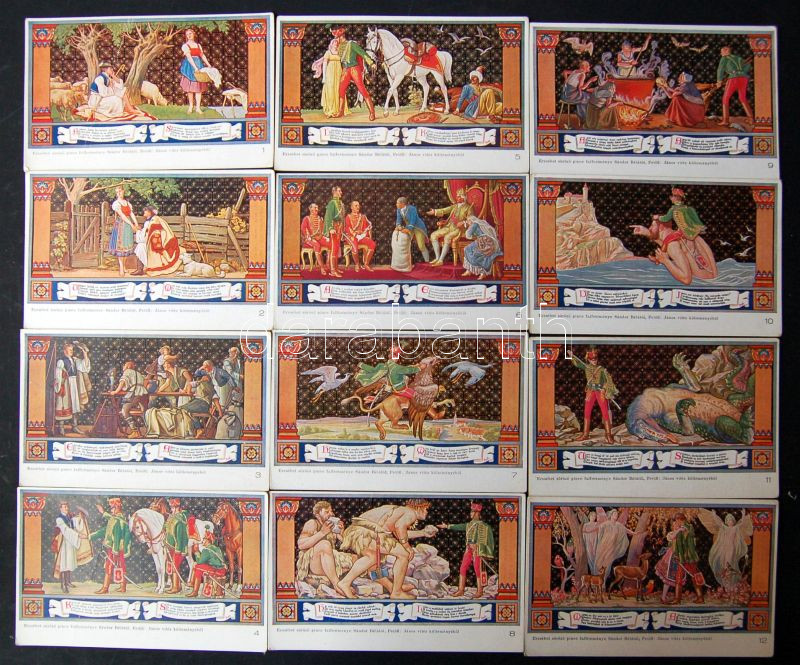 Beschreibung: 1930 Képeslap sorozat: Petőfi: János Vitéz Erzsébet söröző falfestménye 12 db számozott lap