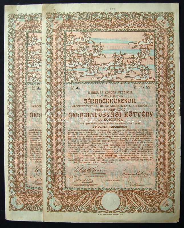 1912. Járadékkölcsön államadóssági kötvény 100K-ról (2x) egymásutáni s... https://www.darabanth.com/de/103-Fernauktion/103.0/Numismatik/~40004/1912-Jaradekkolcson-allamadossagi-kotveny-100K-rol-2x-egymasutani-sorszammal-szelvC3~II251257