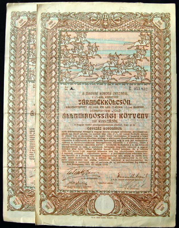 Beschreibung: 1912. Járadékkölcsön államadóssági kötvény 100K-ról (2x), szelvényekkel