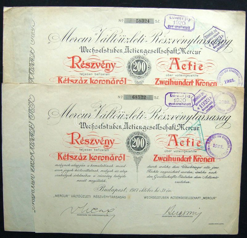 1917. "Mercur Váltóüzleti Részvénytársaság" részvénye 200K-ról (2x) eg... https://www.darabanth.com/de/103-Fernauktion/103.0/Numismatik/~40004/1917-Mercur-Valtouzleti-Reszvenytarsasag-reszvenye-200K-rol-2x-egyugrasu-sorszamok~II252058