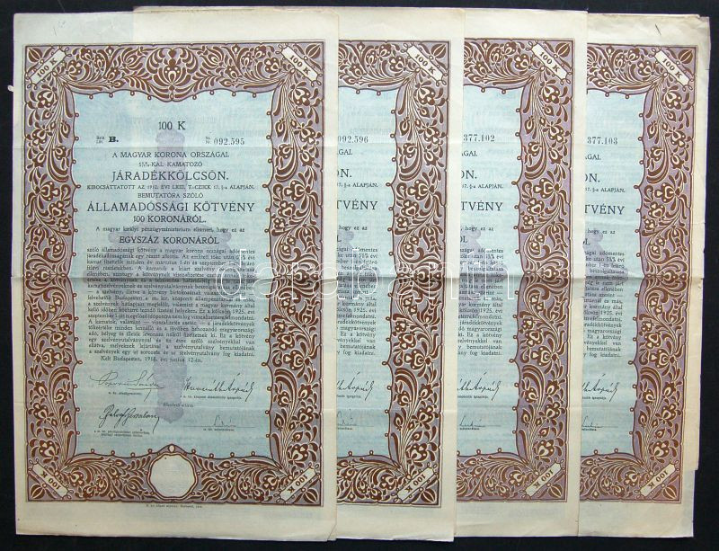1918. "Járadékkölcsön" államadóssági kötvény 100K-ról (4x) 2x2 egymásu... https://www.darabanth.com/de/103-Fernauktion/103.0/Numismatik/~40004/1918-Jaradekkolcson-allamadossagi-kotveny-100K-rol-4x-2x2-egymasutani-sorszammal-~II252044