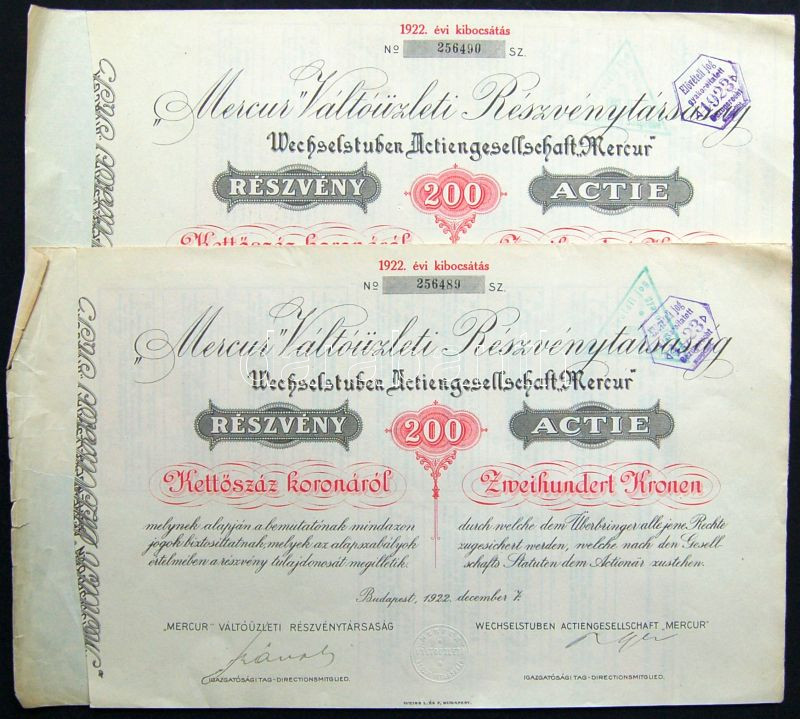 1922. "Mercur Váltóüzleti Részvénytársaság" részvénye 200K-ról (2x) eg... https://www.darabanth.com/de/103-Fernauktion/103.0/Numismatik/~40004/1922-Mercur-Valtouzleti-Reszvenytarsasag-reszvenye-200K-rol-2x-egymasutani-sorszam~II252050