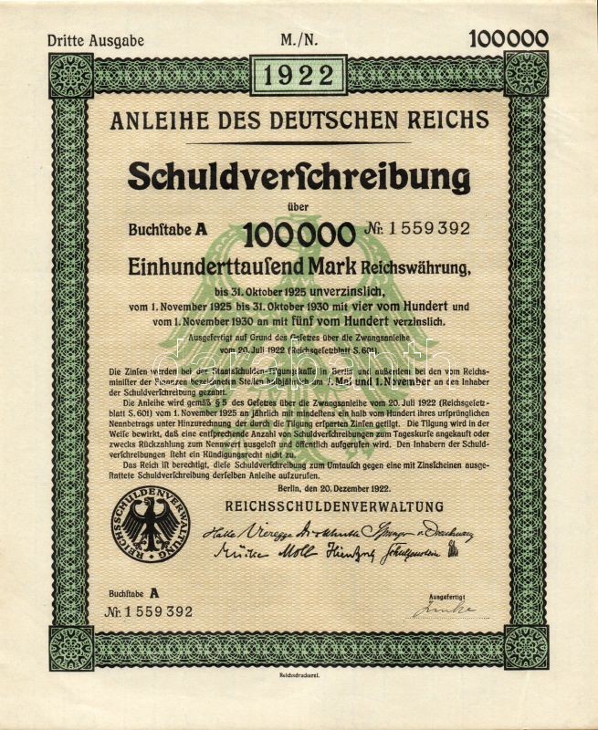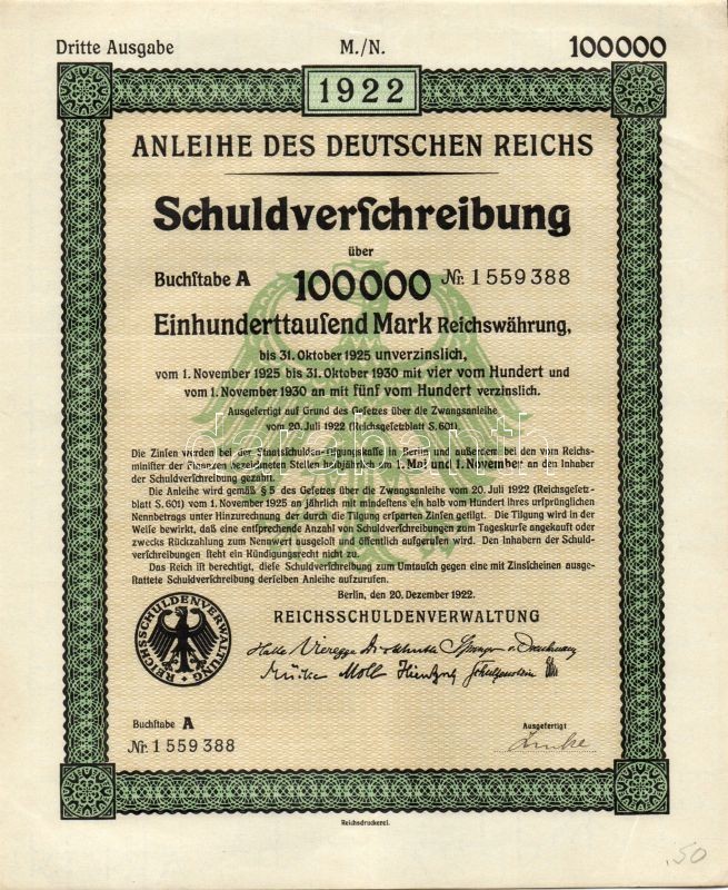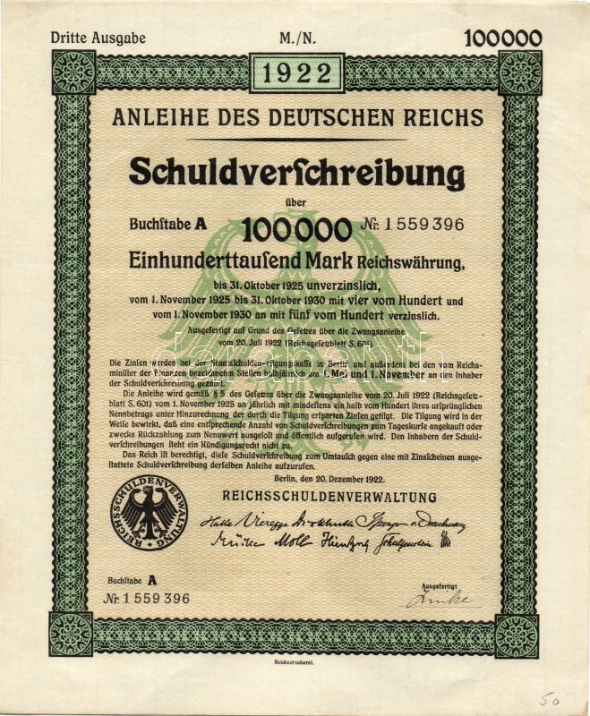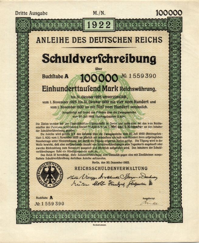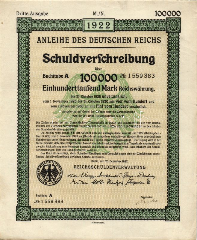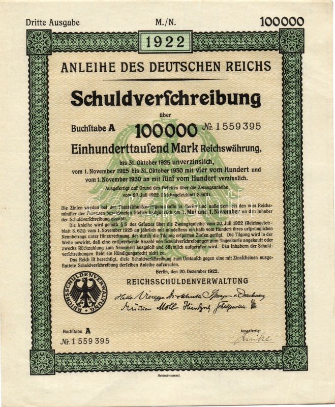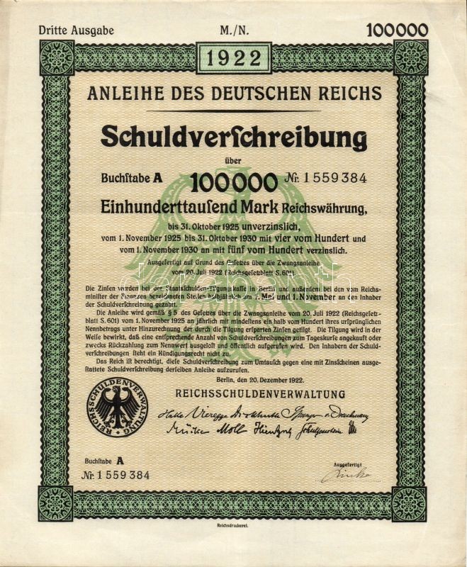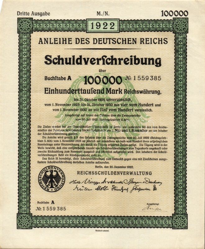 Német Birodalom/Weimari Köztársaság 1922. "Schuldverschreibung" 100.00... https://www.darabanth.com/de/103-Fernauktion/103.0/Numismatik/~40004/Nemet-BirodalomWeimari-Koztarsasag-1922-Schuldverschreibung-100000M-rol-14x-egymasutan~II252029