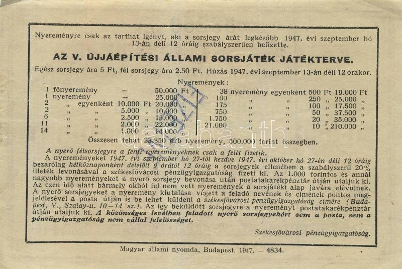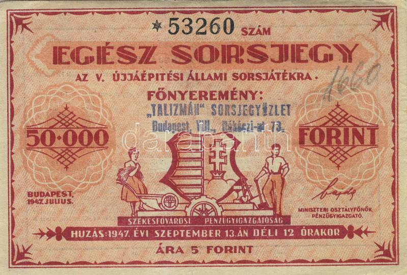 1947. Egész sorsjegy 50.000Ft az V.Újjáépítési Állami Sorsjátékra T:II https://www.darabanth.com/de/103-Fernauktion/103.0/Numismatik/~40005/1947-Egesz-sorsjegy-50000Ft-az-VUjjaepitesi-Allami-Sorsjatekra-TII~II251928