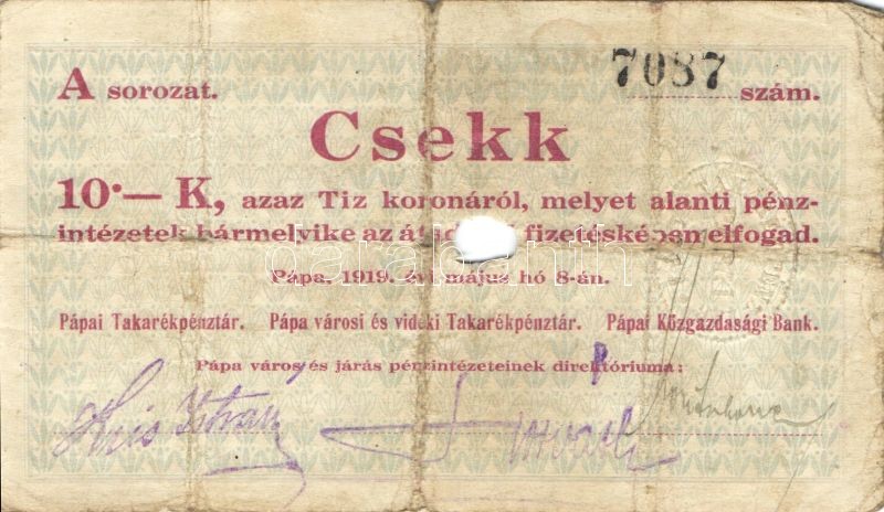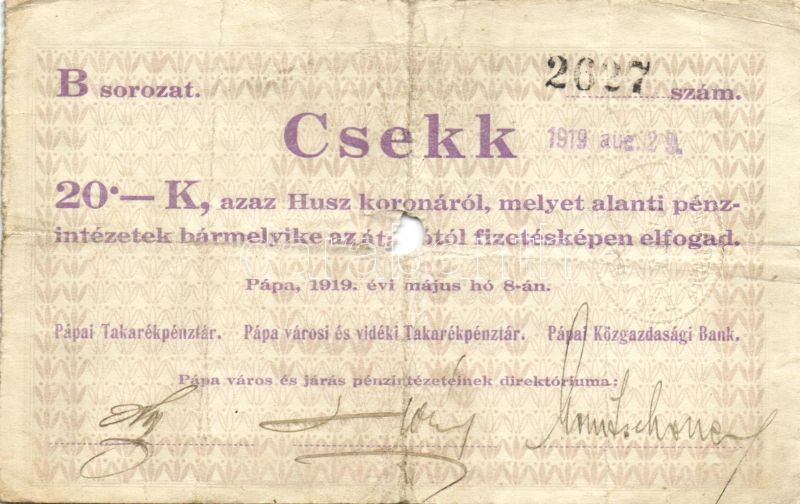 Pápa 1919. "Pápai csekk" 10K (2x), 20K (2x) lyukasztással érvénytelení... https://www.darabanth.com/de/103-Fernauktion/103.0/Numismatik/~40005/Papa-1919-Papai-csekk-10K-2x-20K-2x-lyukasztassal-ervenytelenitve-TIII-III-IV~II249560