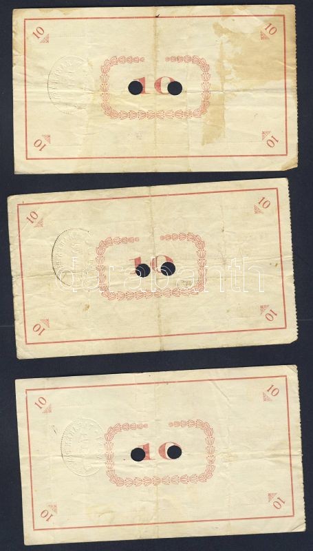 Beschreibung: Pápa 1919. "Pápai csekk" 10K (3x) két lyukasztással érvénytelenített (Adamovszky nem említi!) T:III,III-
