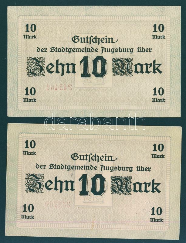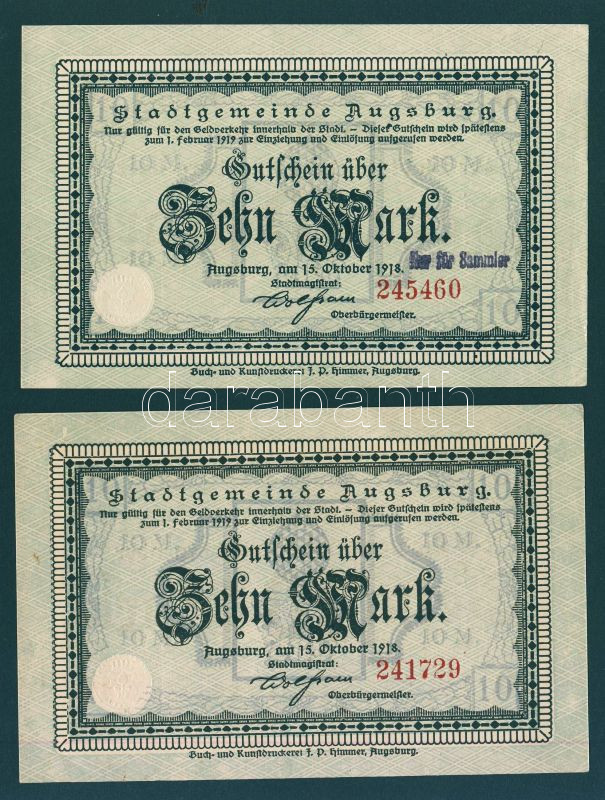 Beschreibung: Német Birodalom/Császárság/Augsburg 1918.10.15. 10M (2x) az egyik hivatalos érvénytelenítéssel T:I,I-