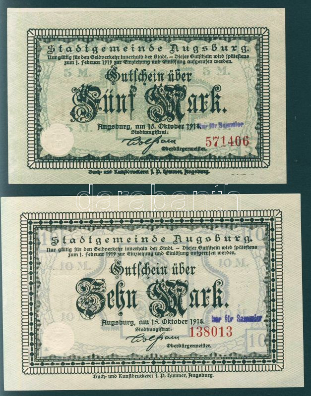 Német Birodalom/Császárság/Augsburg 1918.10.15. 5M, 10M hivatalos érvé... https://www.darabanth.com/de/103-Fernauktion/103.0/Numismatik/~40006/Nemet-BirodalomCsaszarsagAugsburg-19181015-5M-10M-hivatalos-ervenytelenitessel-TI~II250749