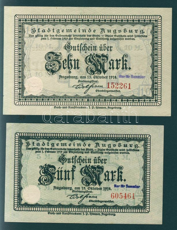 Beschreibung: Német Birodalom/Császárság/Augsburg 1918.10.15. 5M, 10M hivatalos érvénytelenítéssel T:I