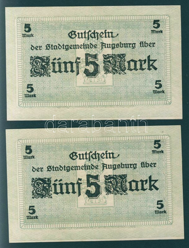 Német Birodalom/Császárság/Augsburg 1918.10.15. 5M (2x) egyugrású sors... https://www.darabanth.com/de/103-Fernauktion/103.0/Numismatik/~40006/Nemet-BirodalomCsaszarsagAugsburg-19181015-5M-2x-egyugrasu-sorszammal-hivatalos-ervC3~II250736