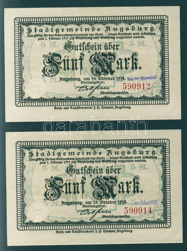 Beschreibung: Német Birodalom/Császárság/Augsburg 1918.10.15. 5M (2x) egyugrású sorszámmal, hivatalos érvénytelenítéssel T:I,I-