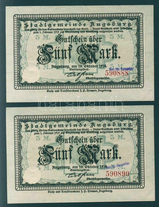Beschreibung: Német Birodalom/Császárság/Augsburg 1918.10.15. 5M (2x) egyugrású sorszámmal, hivatalos érvénytelenítéssel T:I,I-