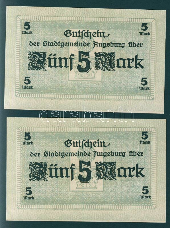 Német Birodalom/Császárság/Augsburg 1918.10.15. 5M (2x) egyugrású sors... https://www.darabanth.com/de/103-Fernauktion/103.0/Numismatik/~40006/Nemet-BirodalomCsaszarsagAugsburg-19181015-5M-2x-egyugrasu-sorszammal-hivatalos-ervC3~II250745