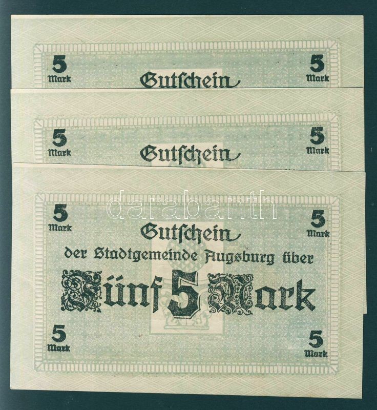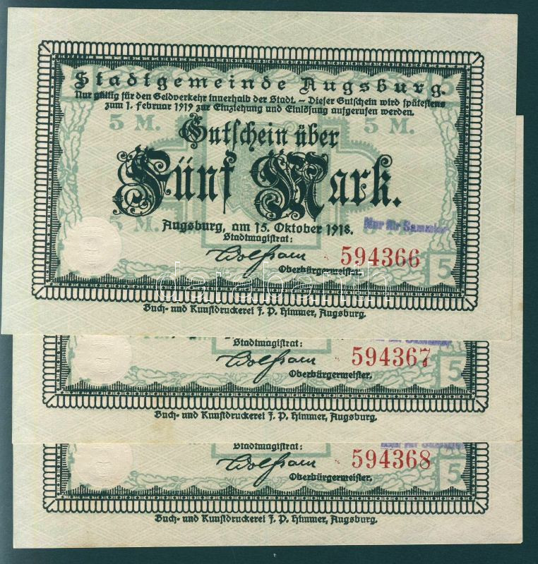 Német Birodalom/Császárság/Augsburg 1918.10.15. 5M (3x) egymásutáni so... https://www.darabanth.com/de/103-Fernauktion/103.0/Numismatik/~40006/Nemet-BirodalomCsaszarsagAugsburg-19181015-5M-3x-egymasutani-sorszammal-hivatalos-er~II250735