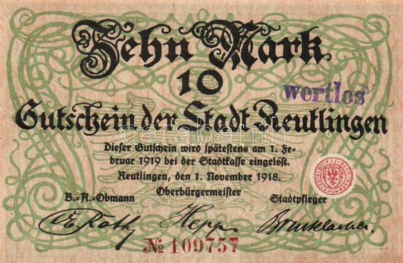 Német Birodalom/Császárság/Reutlingen 1918.11.1. 10M (2x) egymásutáni ... https://www.darabanth.com/de/103-Fernauktion/103.0/Numismatik/~40006/Nemet-BirodalomCsaszarsagReutlingen-1918111-10M-2x-egymasutani-sorszammal-hivatalos-C3~II249898