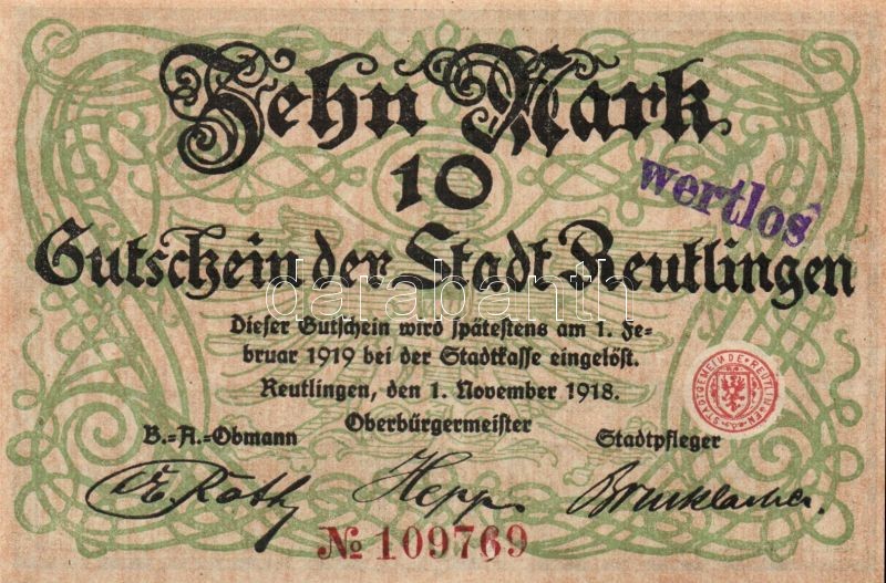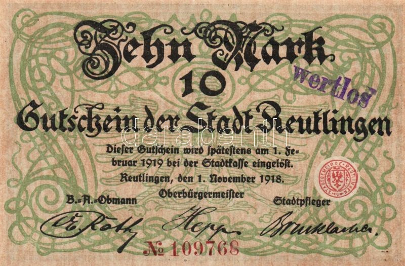 Német Birodalom/Császárság/Reutlingen 1918.11.1. 10M (5x) egymásutáni ... https://www.darabanth.com/de/103-Fernauktion/103.0/Numismatik/~40006/Nemet-BirodalomCsaszarsagReutlingen-1918111-10M-5x-egymasutani-sorszammal-hivatalos-C3~II249901
