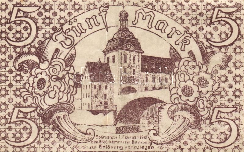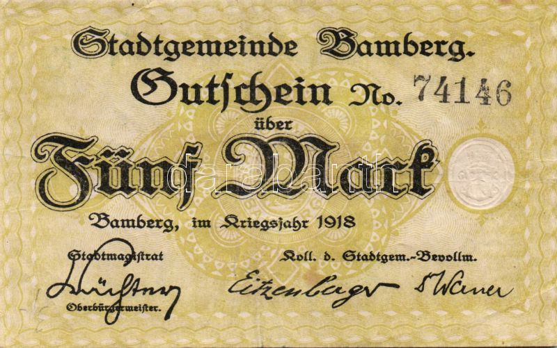 Beschreibung: Német Birodalom/Weimari Köztársaság/Bamberg 1918. 5M fekete sorszámmal T:II/III